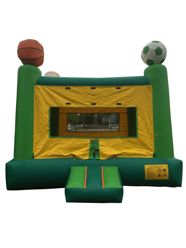 The XL Sports fanatic is a larger version of our $125 Sports Fanatic with its bright colors of this sport styling will have young ones enjoying the fun and play for hours. Inflatable sports balls add decoration to the four exterior columns, and a matching scoreboard can be found over the inflatable entrance/exit ramp. The play area is bordered by mesh-covered window openings on all four sides. Whether you are having a birthday party, end of season team celebration or having a community event, this bright colored sports themed bounce house will provide hours of fun.