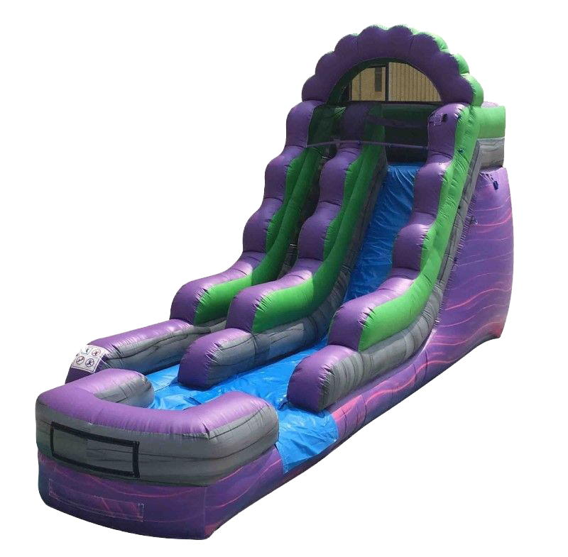 Cool off from the summer heat with the 16' Purple Marble Inflatable Water Slide. This slide provides fun and excitement to kids of all ages. Whether you’re having a themed party or event, this slide can be used without water on a cool day to create some big smiles or for $25.00 more make it a water slide. You must provide a standard garden hose and we will do the rest to cool you down on a hot day so you can coast down for some wet refreshment!